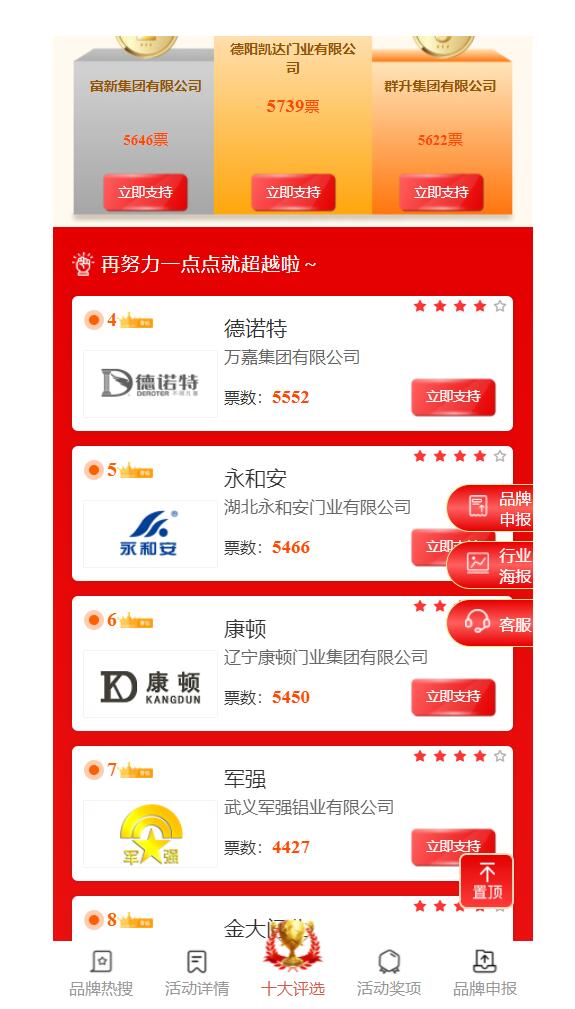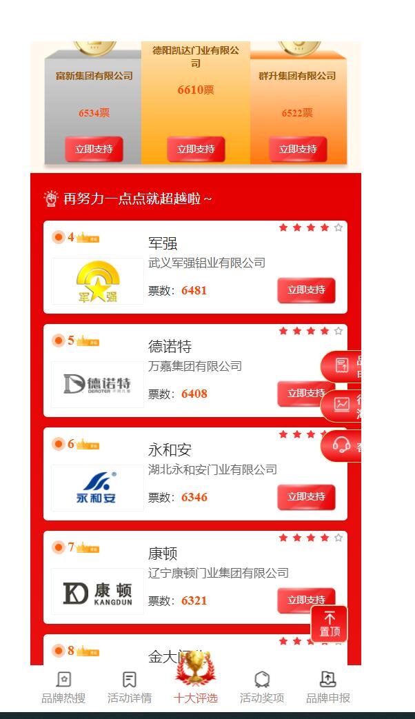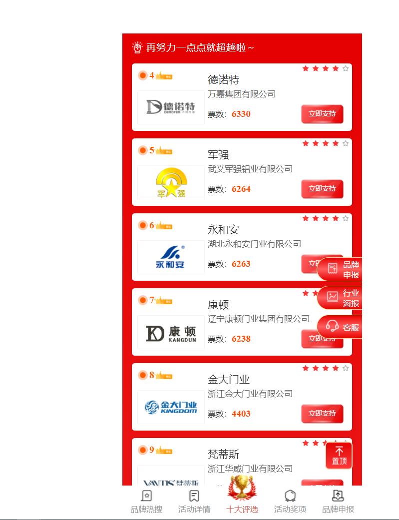 本次網絡評選300余家,囊括國內所有中高端鑄鋁門生產廠家。通過短短幾天時間的投票,武義軍強鋁藝有限公司得到網民的廣大認可,從第17名快速升到第4名,從而顯現出軍強品牌在社會的影響力、知名度以及網民的認可度。